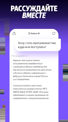 Pro hlubší úkoly využijte režim uvažování, kde **Alice AI** poskytuje promyšlené a podrobné odpovědi s expertními závěry a odůvodněnými řešeními. Ponořte se do tvůrčího psaní – od osobních e-mailů a studijních úkolů až po obchodní návrhy. Asistent **Yandex Alice** vám pomůže s brainstormingem, generováním nápadů a tvorbou poutavých popisů či šablon textů. Nechte **Yandex ART** model oživit vaše představy – generujte působivé obrázky pro sociální sítě, loga nebo přání, a dokonce vytvářejte AI videa. **Alice AI** je také skvělým pomocníkem pro programování, vysvětlování logiky, sdílení zajímavých faktů a poskytování cenných rad a plánovacích algoritmů.