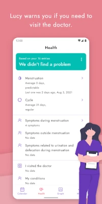 Lucy - Period tracker calendar je váš chytrý gynekologický asistent. Sleduje menstruaci, plodné dny a díky umělé inteligenci vás upozorní na potenciální gynekologické problémy na základě vašich symptomů. Pečujte o své ženské zdraví s Lucy a získejte cenné informace od expertů.