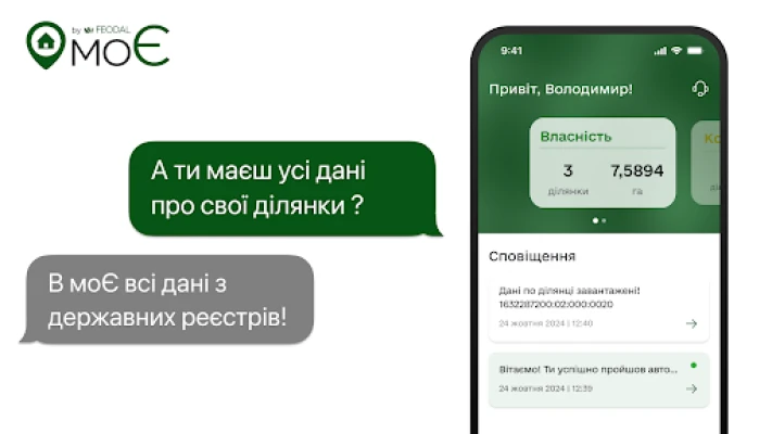 Aplikace "моЄ - дані про твої ділянки" je spolehlivý pomocník pro majitele pozemků. Získejte aktuální informace z oficiálních zdrojů o vašich parcelách, včetně katastrálního čísla, účelu, plochy a nájemních smluv. Vizualizujte hranice a polohu přímo na mapě pro efektivní správu.